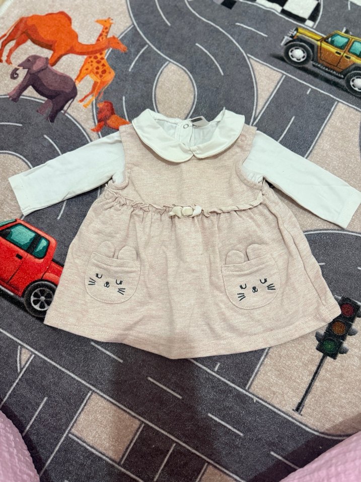 Bej renkli, uzun kollu, yakalı ve bol kesim örme kız bebek elbisesi. Ceplerde kedi yüzü nakışı vardır. Yumuşak ve sıcak kumaştan yapılmıştır. Hafif simlidir