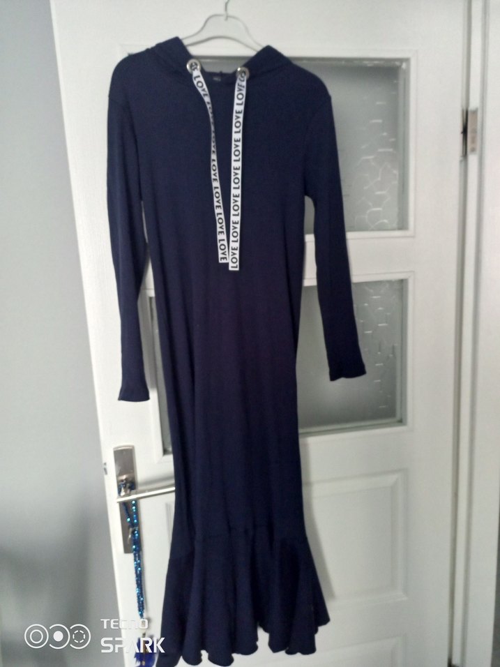 Uzun kollu, bol kesim örme elbise, bisiklet yaka ve koyu mavi renkte, rahat sokak stili için uygundur. Desensiz ve volanlı etek ucu vardır.