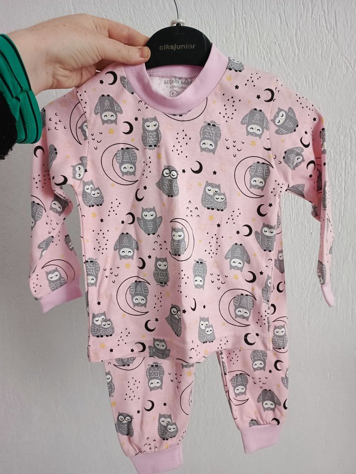 Pembe renkli, uzun kollu ve örme kumaştan yapılmış, baykuş desenli bebek kıyafet takımı. iade yoktur 1 yaş için dir