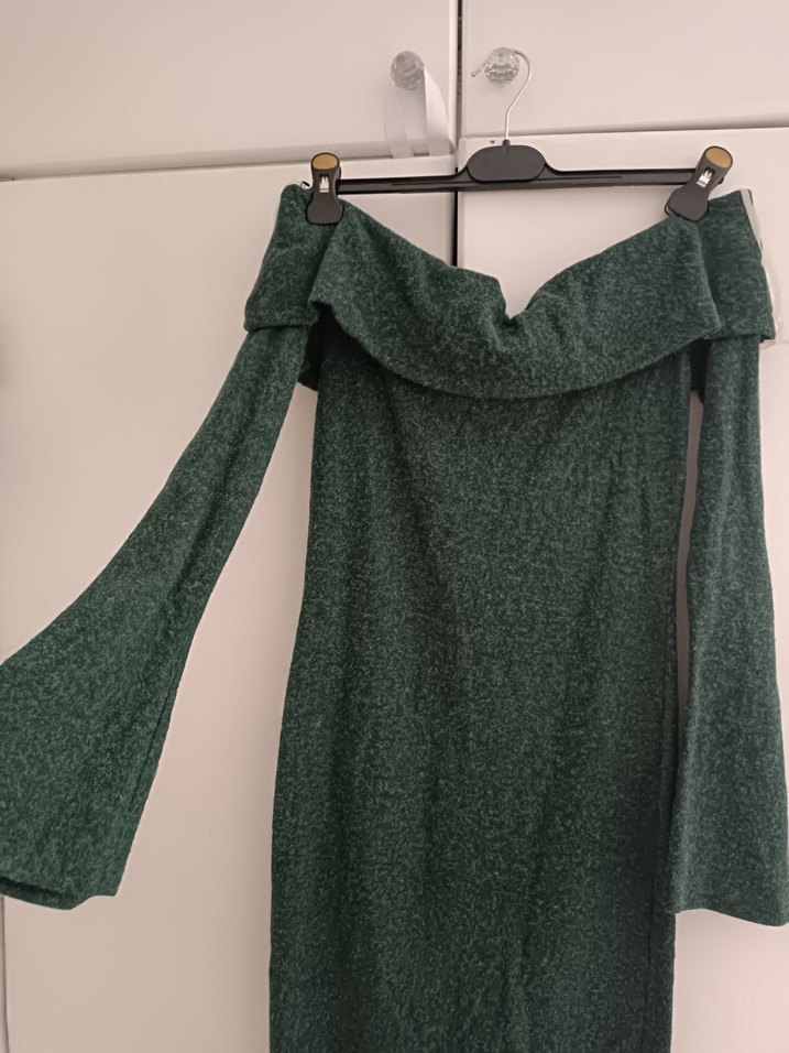 Yeşil-gri tonlarında, uzun kollu, straplez yaka ve vücuda oturan örme elbise. Desensiz ve gündelik kullanıma uygun, rahat ve şık görünüme sahip.hic giyilmedi