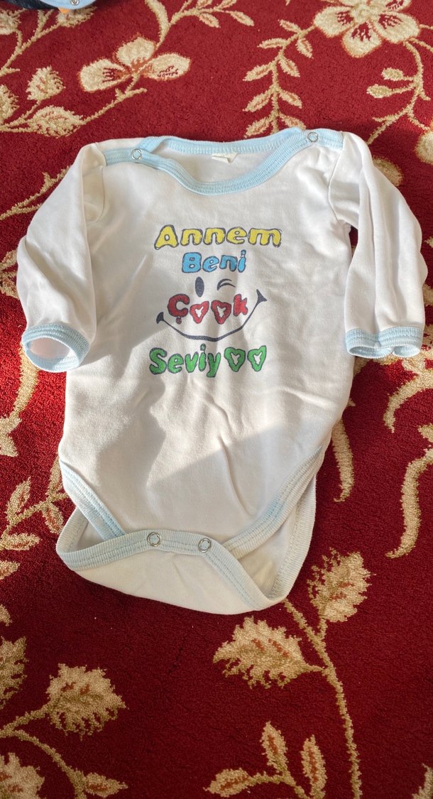 Beyaz pamuklu uzun kollu bebek body, pastel renkli yazı baskılı ve çıtçıtlı. Önünde "Annem Beni Çok Seviyor" yazısı var. Yuvarlak yaka rahatlık sağlar.