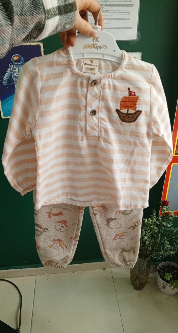 Uzun kollu, düğmeli ve gemi baskılı açık kahverengi çizgili üst ile deniz temalı desenli pamuklu bebek erkek pantolon takımı. Crew yaka ve lastikli manşetler rahatlık sağlar. ketendir ( 6-9/ 9-12 ay mevcuttur)