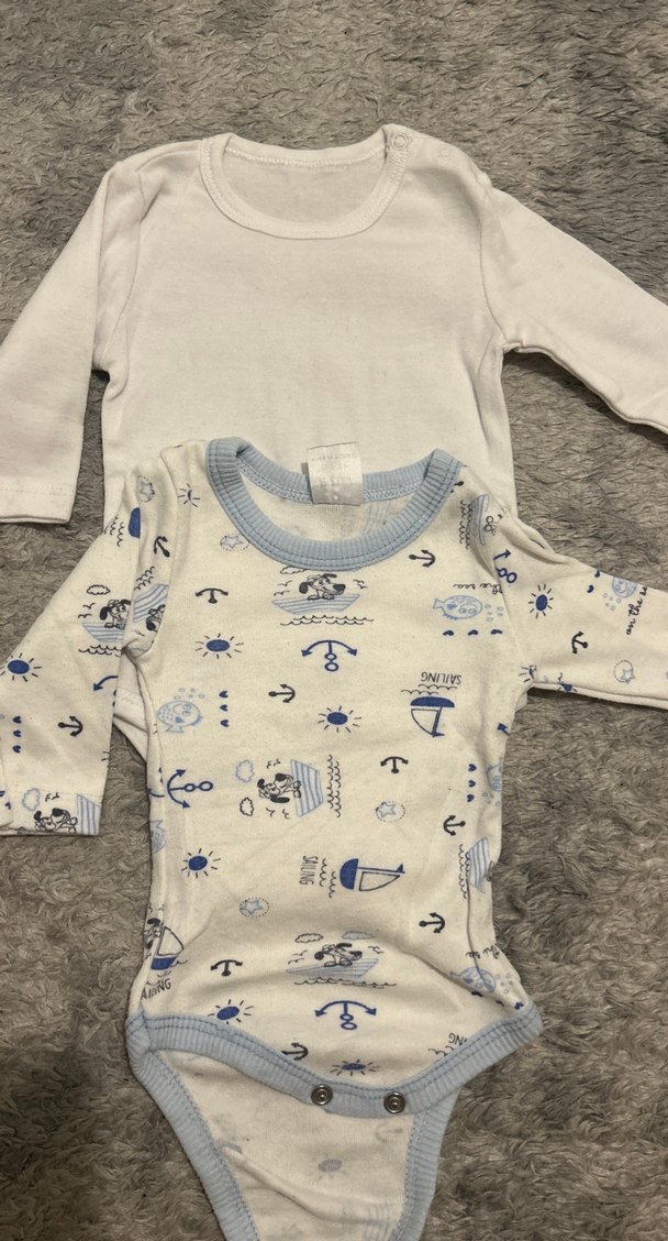 Beyaz ve mavi deniz temalı baskılı, uzun kollu pamuklu erkek bebek body seti, yuvarlak yakalı ve örme dokuda.