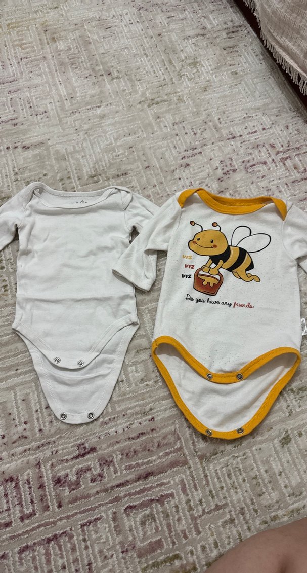 Uzun kollu, pamuklu iki bebek body seti. Biri düz beyaz, diğeri arı baskılı ve sarı detaylı. Yaka yuvarlak, çıtçıtlı.