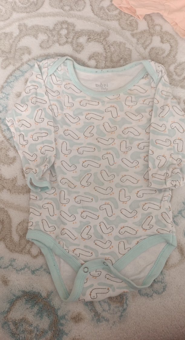 Yumuşak pamuklu, uzun kollu, düğmeli ve beyaz-pastel ördek desenli bebek body