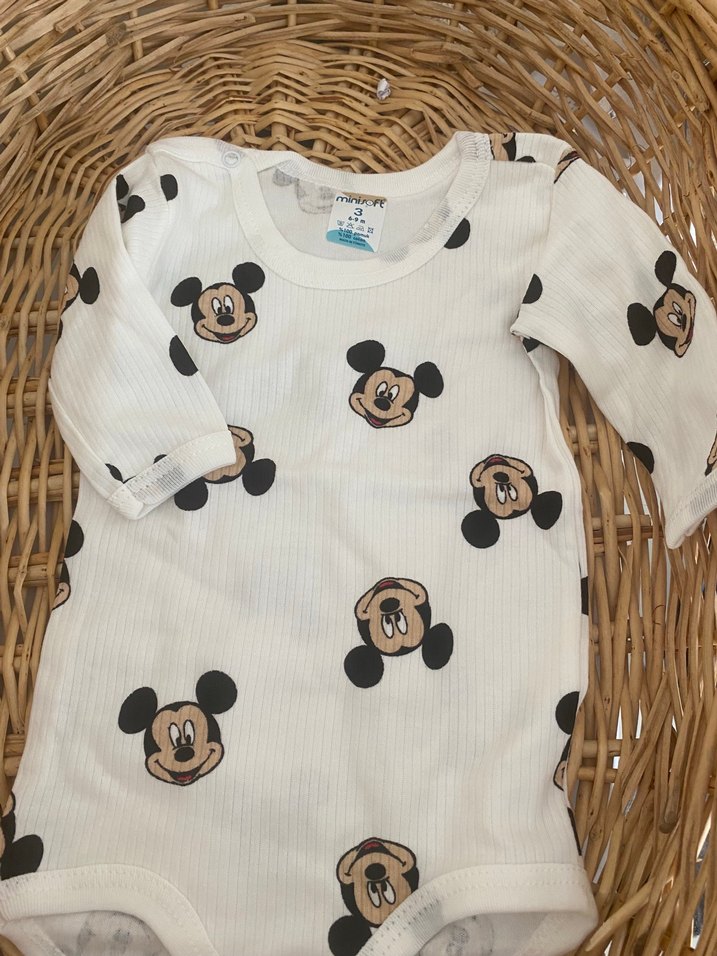 Uzun kollu ve yuvarlak yakalı bebek body, yumuşak örme pamuktan üretilmiştir. Beyaz zemin üzerinde koyu renkli Mickey Mouse baskıları vardır.