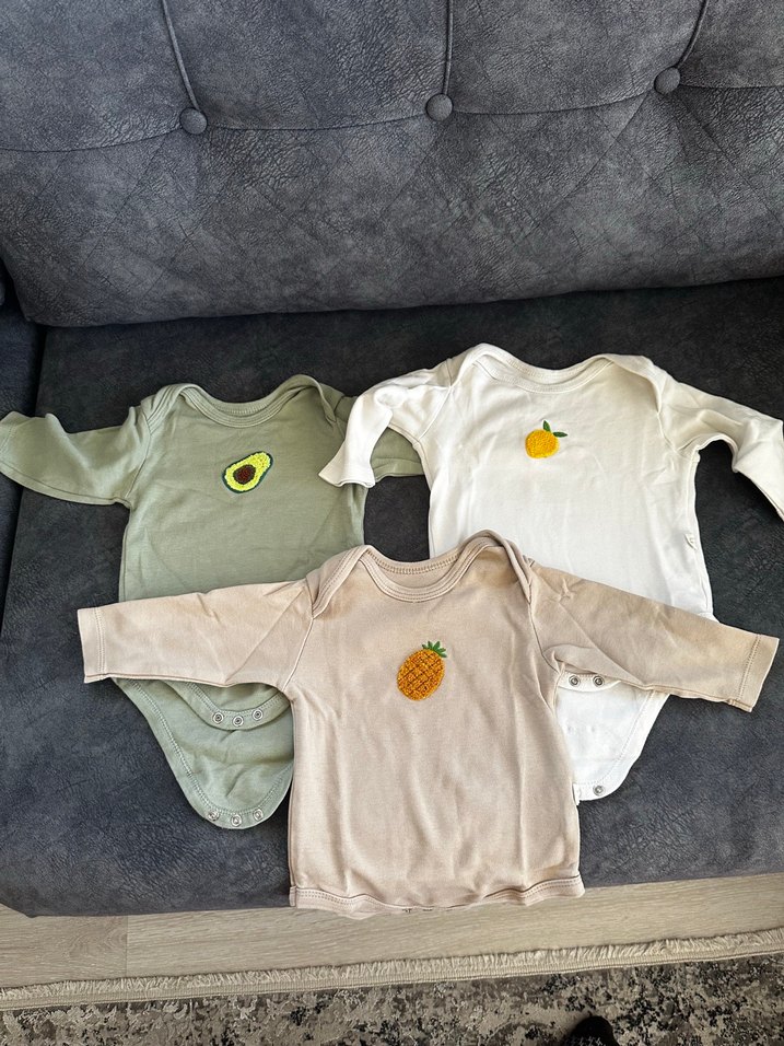 Pastel renklerde, pamuklu uzun kollu bebek body, yuvarlak yaka ve düğmeli, meyve desenleriyle süslenmiş.