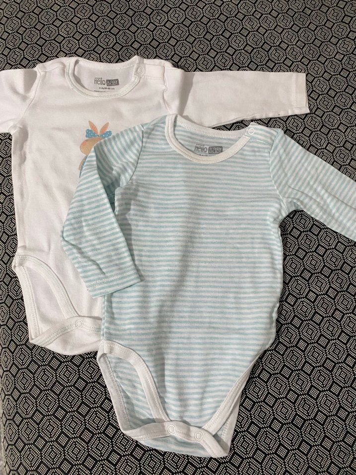 Toplu fiyattır. Bebekler için pamuklu, uzun kollu, yuvarlak yakalı body seti. Pastel beyaz ve açık mavi çizgili, sade ve rahat tasarım.