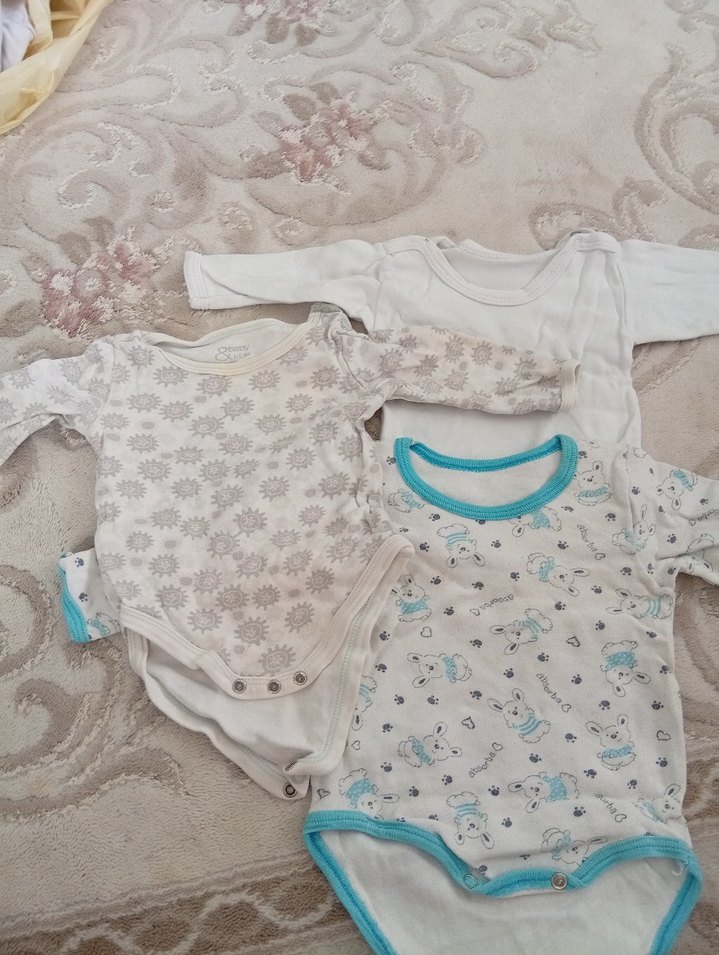 Yumuşak pamuktan, uzun kollu ve bisiklet yaka, beyaz, gri ve desenli olarak örülmüş üçlü bebek body seti.