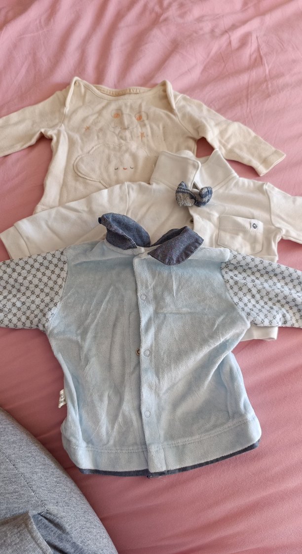 Pastel gri tonlarda, düğmeli, uzun kollu pamuklu bebek hastane kıyafeti. Desensiz, rahat kesim bir modeldir.