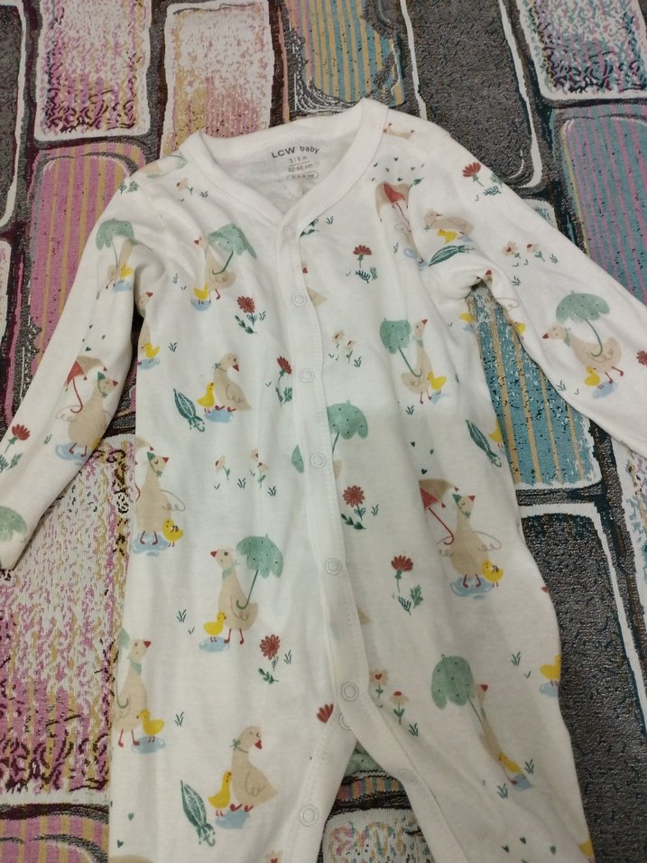 Uzun kollu ve yuvarlak yakalı, yumuşak pamuktan pastel baskılı bohem tarzda bebek tulumu. Düğmeli kapanışı vardır.