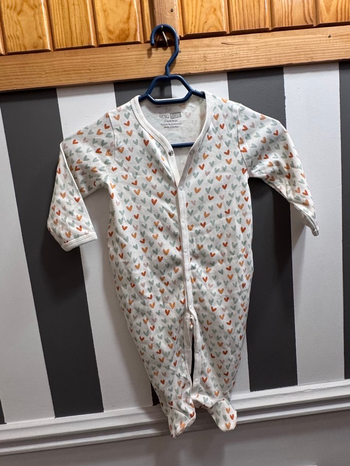 Pamuklu, uzun kollu ve düğmeli bu gri bebek tulumu, renkli baskı deseniyle dikkat çekiyor. Yeni doğanlar için uygundur.