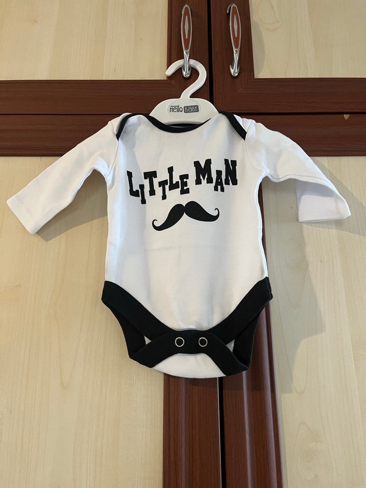 Beyaz pamuklu kumaştan, uzun kollu ve yuvarlak yakalı erkek bebek badi. Alt kısmı düğmeli, üzerinde "LITTLE MAN" baskısı ve bıyık detayı bulunur.