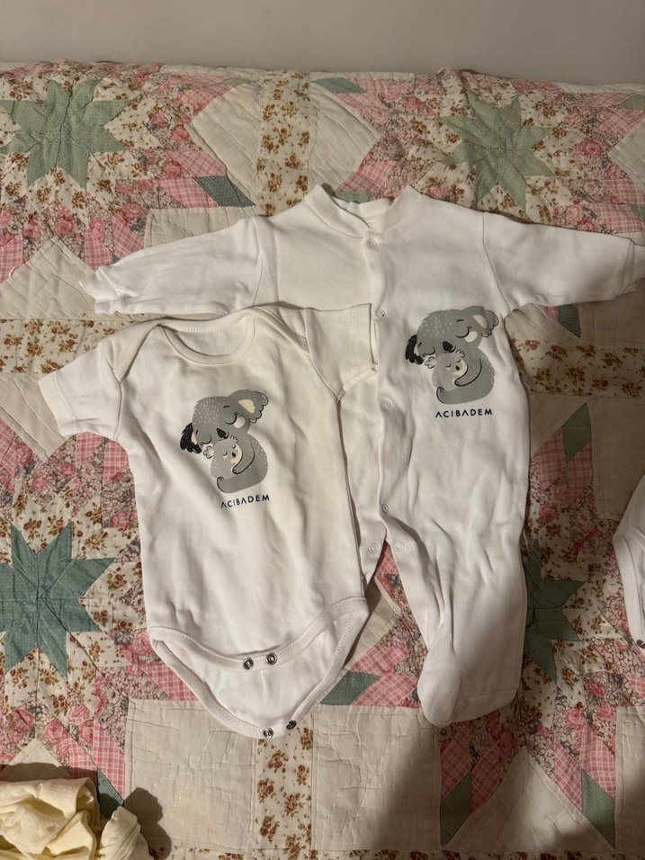 Pamuklu, uzun kollu, düğmeli ve gri baskılı koala desenli iki beyaz acıbadem hastanesinin bebek body takımı. Unisex biz 3 aya kadar kullandık.