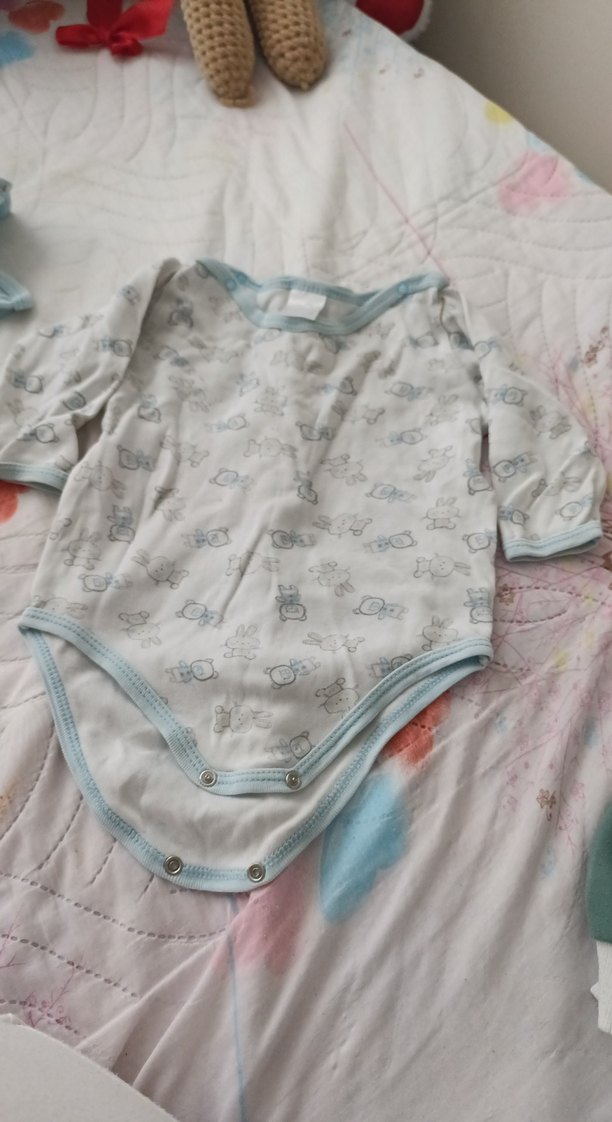 Pastel gri renkte, uzun kollu ve yuvarlak yakalı pamuklu bebek body. Kolay giydirme için düğmeli ve hafif desenlidir.