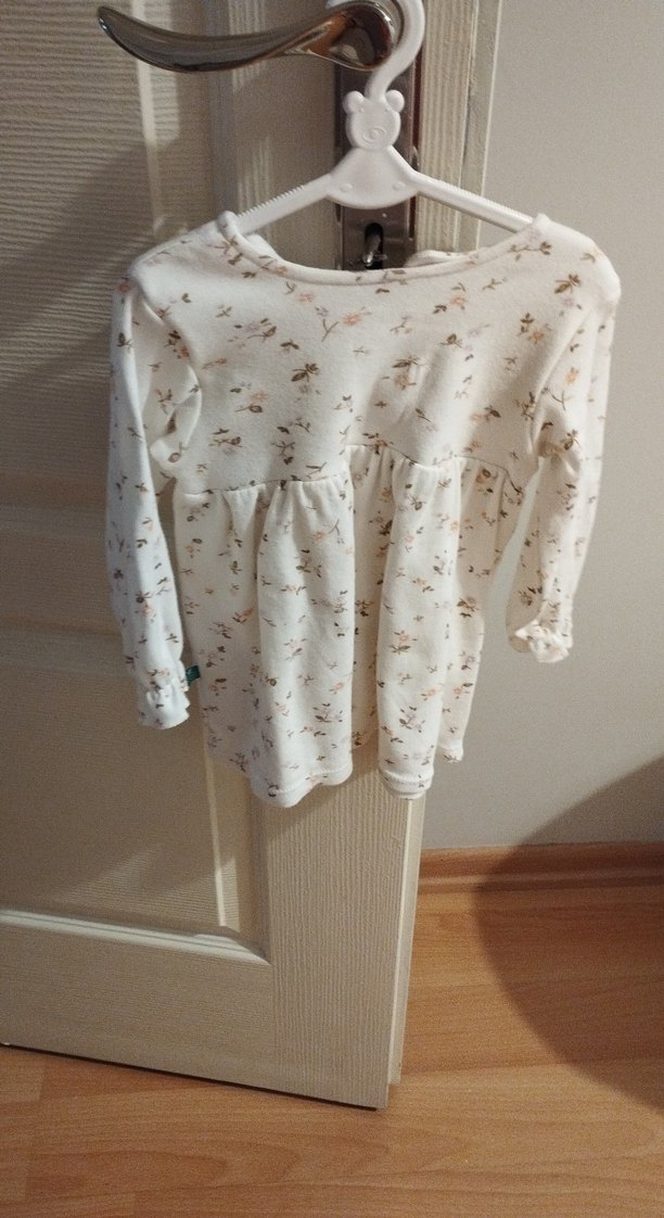 Uzun kollu, yuvarlak yakalı ve bol kesim kız elbisesi. Pamuklu, pastel beyaz renkte, çiçekli baskılı ve fırfır detaylı bohem tarzında.