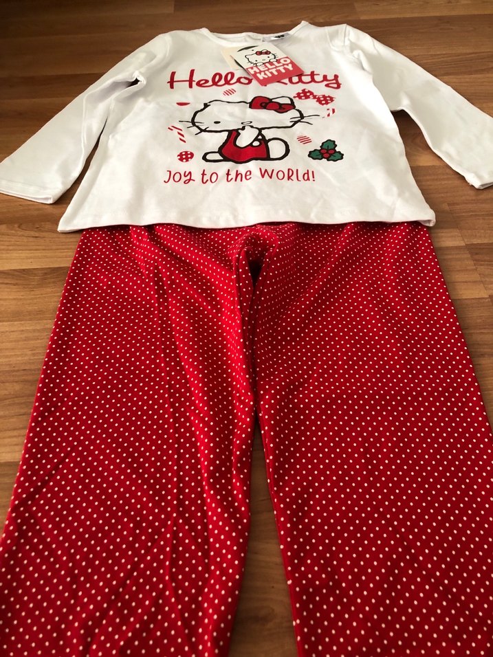Pamuklu, uzun kollu, örme kumaştan yapılmış, renkli Hello Kitty baskılı ve "Joy to the World!" yazılı üst ile kırmızı beyaz puantiyeli pantolonlu kız pijama takımı. Etiketli hiç kullanılmamış sıfır üründür. 6-7 yaşdır. Canlı renklidir.