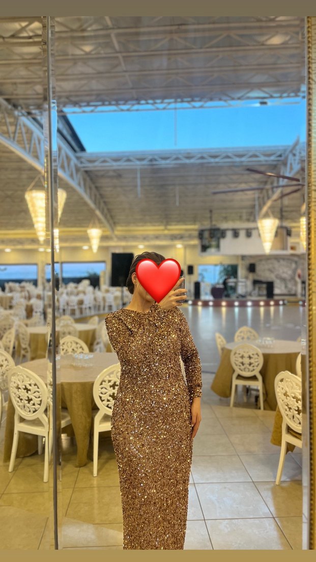 Altın rengi, uzun kollu ve V yakalı bu uzun abiye elbise, parlak leopar deseni ve vücuda oturan kesimiyle düğün ve özel davetler için uygundur. ✨