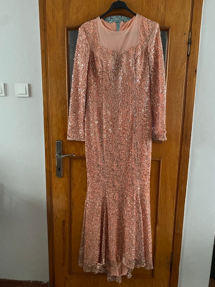 Uzun kollu, dar kesim, yuvarlak yakalı, parlak bej renkli yılan desenli, drapeli uzun abiye elbisedir. ✨