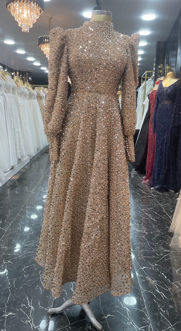Uzun Kollu Parlak Kahverengi Payetli Abiye Elbise