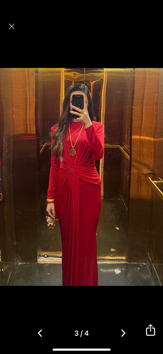 Parlak kırmızı, uzun kollu ve drapeli bu elbise, yüksek yakası ve vücuda oturan kesimiyle romantik geceler için uygun, bohem tarzda.