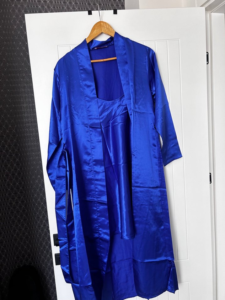 Parlak lacivert saten kumaştan yapılmış, uzun kollu ve uzun boylu minimalist tarzda kadın pijama takımı. Rahat kesimi ve desen içermeyen modeliyle öne çıkar.