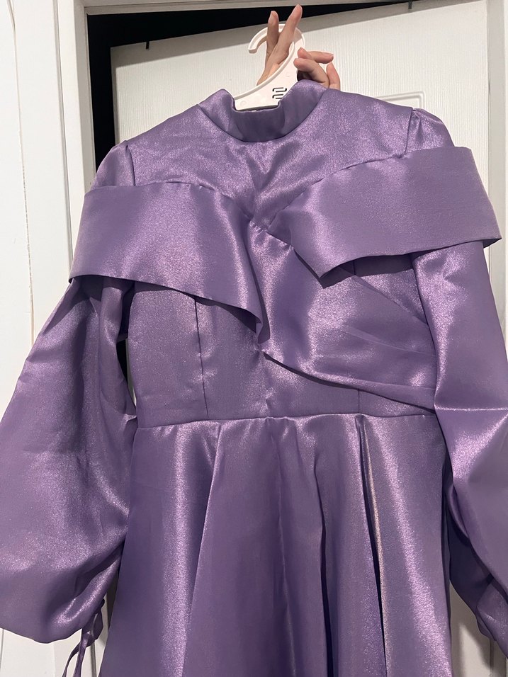 Bu kadın abiye, uzun kollu ve yüksek yakalı, parlak mor kumaştan drapeli tasarıma sahip, düğünler için uygun. Bir kez giyildi temiz.