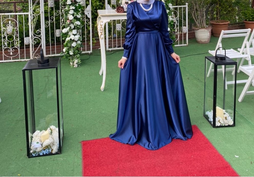 Uzun kollu, parlak mavi abiye elbise yüksek yakalı ve drapeli tasarıma sahiptir. Düğünler için uygun, sade ve rahat kesimlidir. Dökümlü saten kumaş ve kuşaklı elbise. Özel dikimdir.