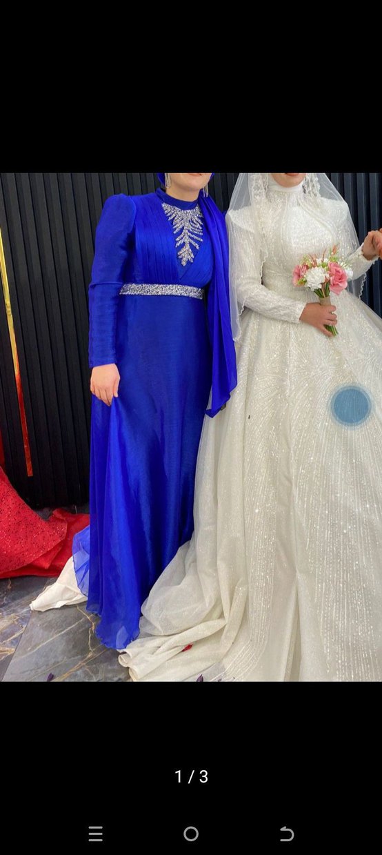 Uzun Kollu Parlak Mavi İşlemeli Kadın Abiye Elbise