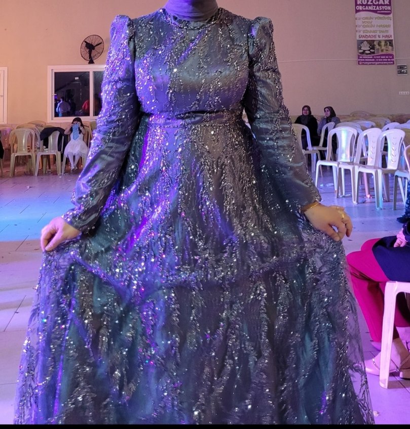 Uzun kollu, yüksek yakalı, bohem tarzda, parlak mor ve simli desenli, fit kesim kadın abiye elbise. Düğünler için uygun, göz alıcı bir model. ✨sadec iki saat gyildi tertemiz