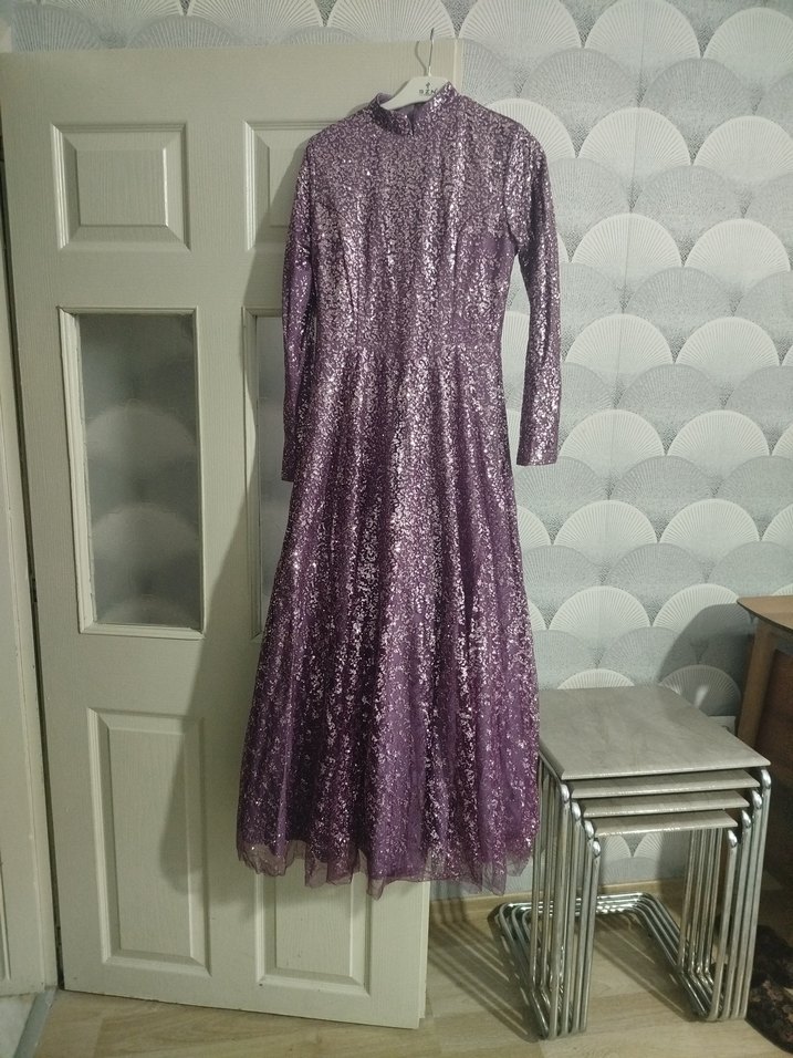 Uzun Kollu Parlak Mor Vintage Abiye Elbise 36 beden