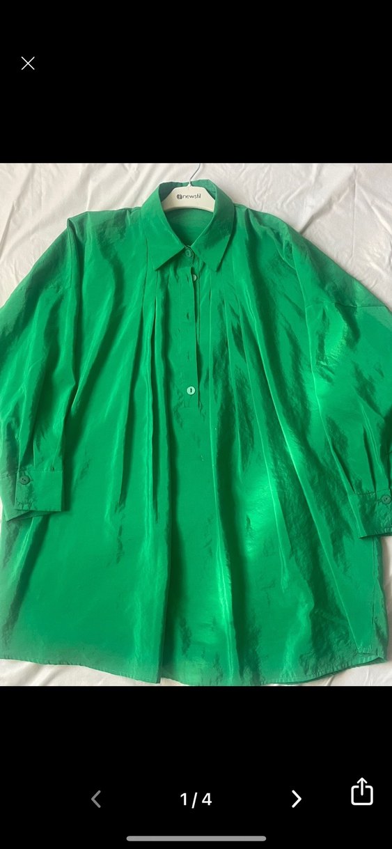 Parlak yeşil, bol kesim kadın gömlek. Yaka ve düğmeli ön detaylarıyla vintage tarzda, uzun kollu.