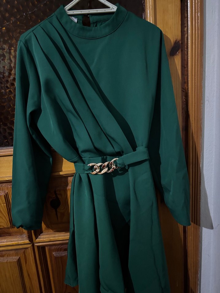 Uzun kollu, parlak yeşil renkte ve klasik tarzda kadın elbisesi. Zincir detaylı kemer ile tamamlanmıştır, desen içermemektedir.