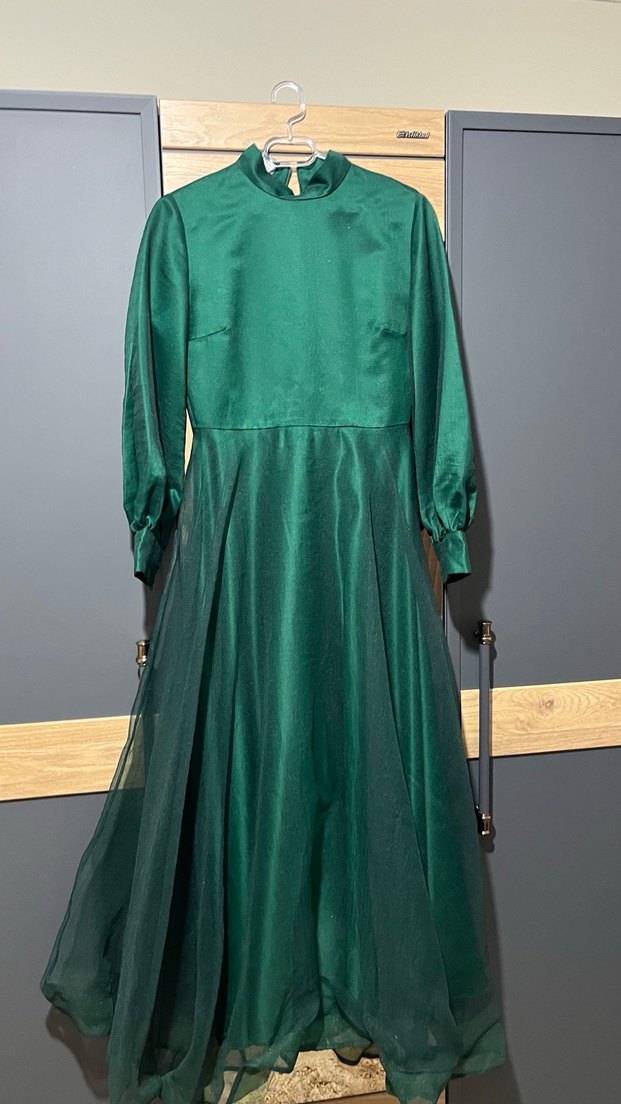Parlak yeşil, uzun kollu ve yüksek yakalı bu elbise, satenimsi kumaştan yapılmıştır. Drapeli tasarımıyla klasik ve modern bir görünüm sunar, düğünler için uygundur. Defosunu ekledim