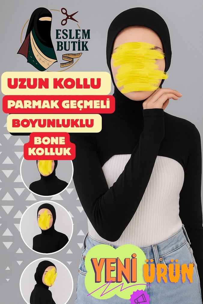 Uzun kollu, parmak geçmeli, boyunluklu ve bone kolluk içeren kadın seti, tam kapama ve rahatlık sağlar.