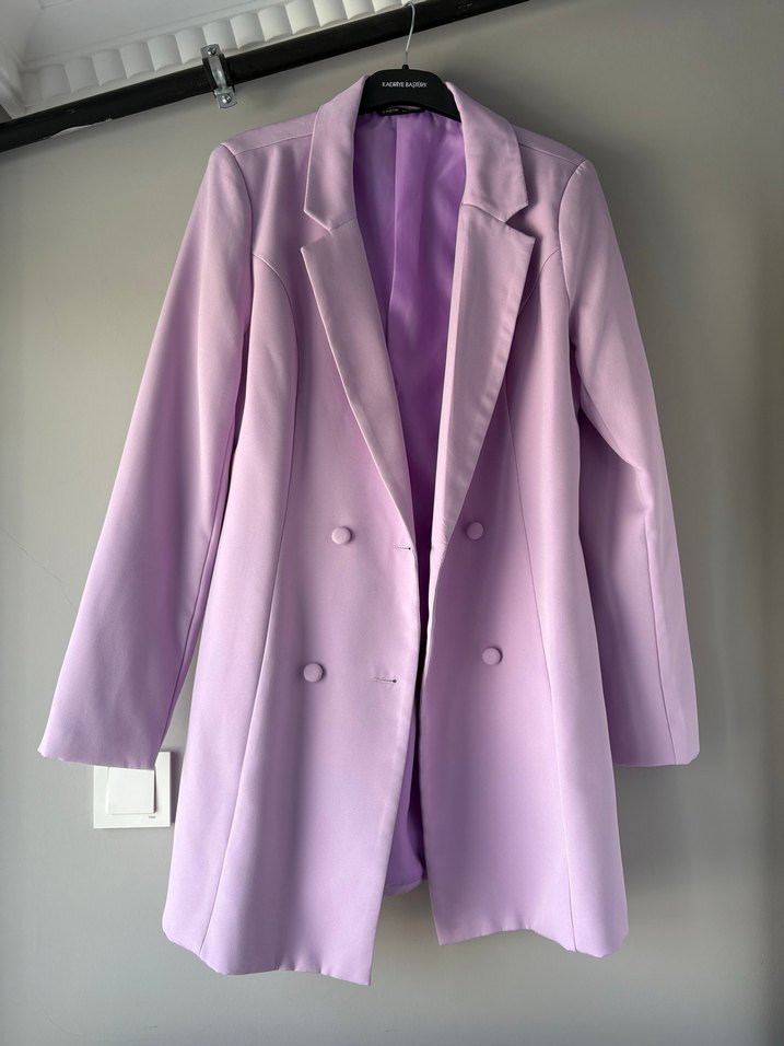 Pastel mor renkte, düğmeli önü ve keskin yaka detayı olan kadın blazer. Uzun kollu ve uzun boylu, sentetik kumaştan üretilmiştir.