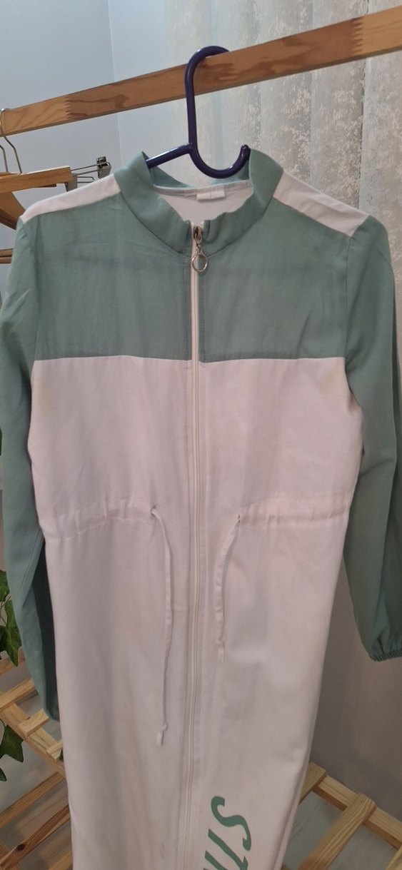 Uzun kollu, uzun boylu kadın tunik önden fermuarlı ve beyaz-pastel yeşil renkte. Sentetik kumaştan, rahat kesimli ve günlük kullanım için uygun.