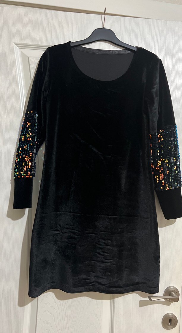 Uzun Kollu Payetli Siyah kadife Kadın Elbise