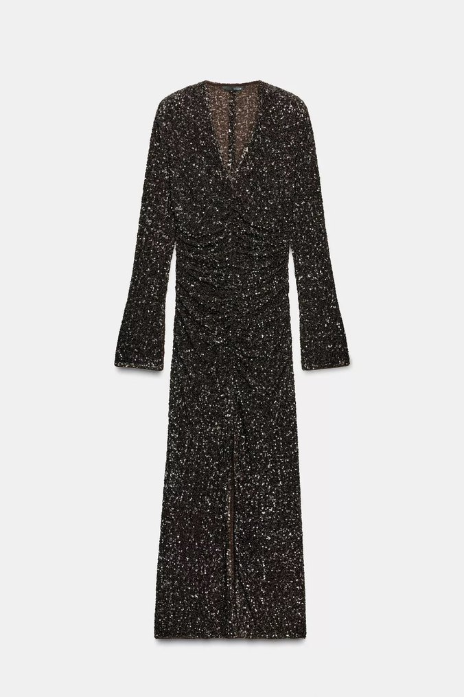 Uzun kollu, V yakalı, kahverengi bağlama desenli ve payetli bu uzun elbise, sentetik kumaştan yapılmıştır ve şık bir parti görünümü sunar. ✨