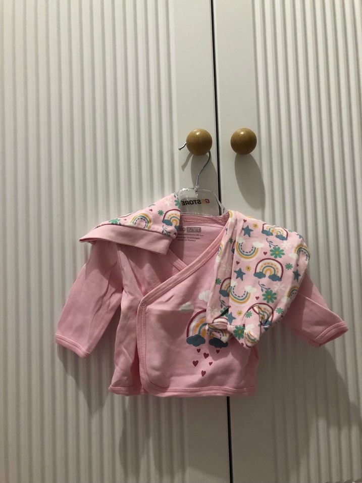 Uzun kollu, pastel pembe renkli ve bağlamalı detaylı bebek kıyafeti, kolay giydirme için düğmeli tasarıma sahiptir.