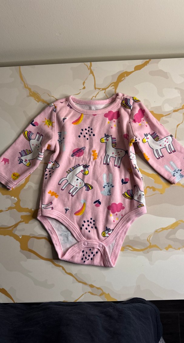 Kolunda çok az bir söküğü var …Uzun kollu, yuvarlak yakalı, pembe renkli ve renkli unicorn desenleriyle örülmüş kız bebek body. Sıcak ve rahat bir kullanım sunar.
