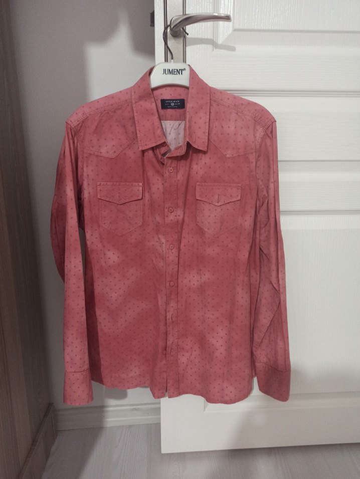 Pembe renkli, uzun kollu erkek gömleği, notlu yakalı ve normal kesimdir. Batik desenli, parlak yüzeyli ve düğmeli ceplidir. Günlük sokak tarzı için uygundur.
