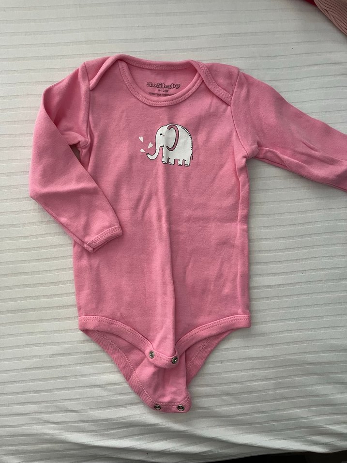 Pastel pembe renkte, uzun kollu ve yuvarlak yakalı bebek body. Alt kısmında düğmeli ve önünde fil desenli.