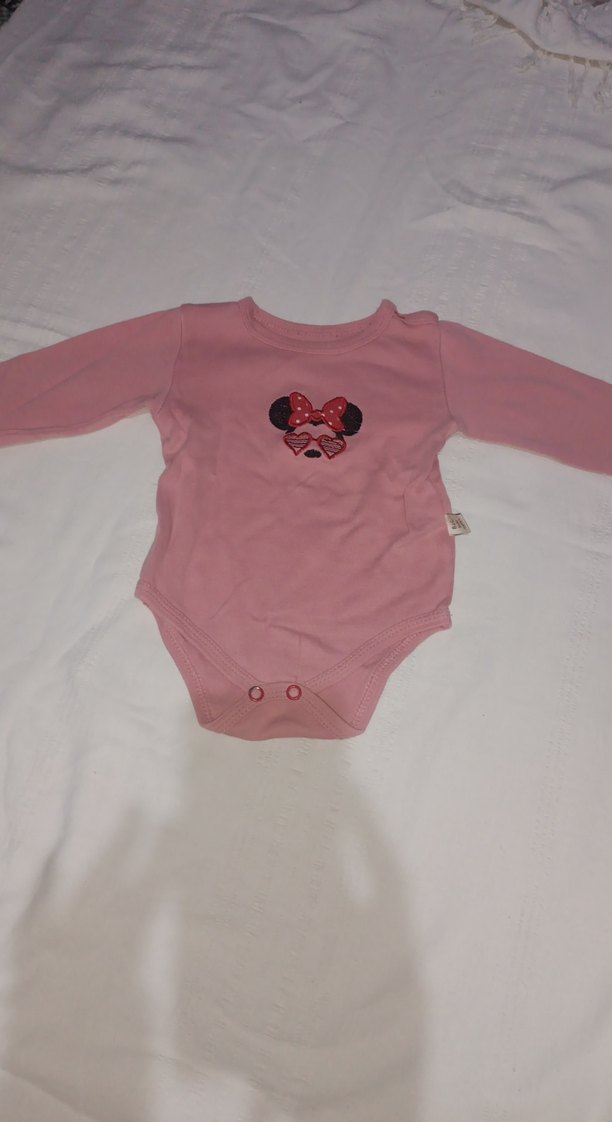 Pastel pembe renkli, uzun kollu, yuvarlak yakalı bebek body. Önde baskılı Minnie Mouse deseni ve düğmeli kapanışı vardır.