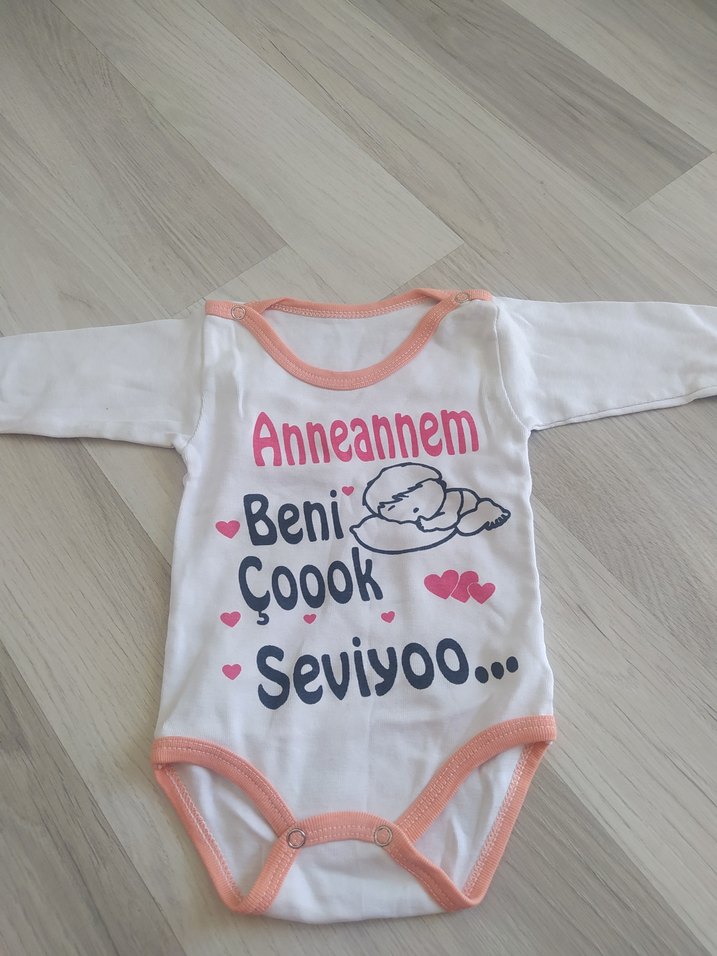Pastel pembe, uzun kollu ve yuvarlak yaka örme bebek body. Üzerinde anneannelerden sevgi mesajı içeren baskı bulunur. iki adet zıbın