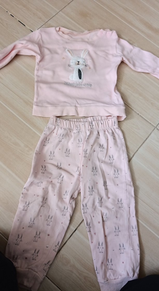 Pastel pembe uzun kollu bebek kız takımı, sevimli tavşan nakışı ve küçük tavşan desenli pantolon ile zahmetsiz şıklık sunar.