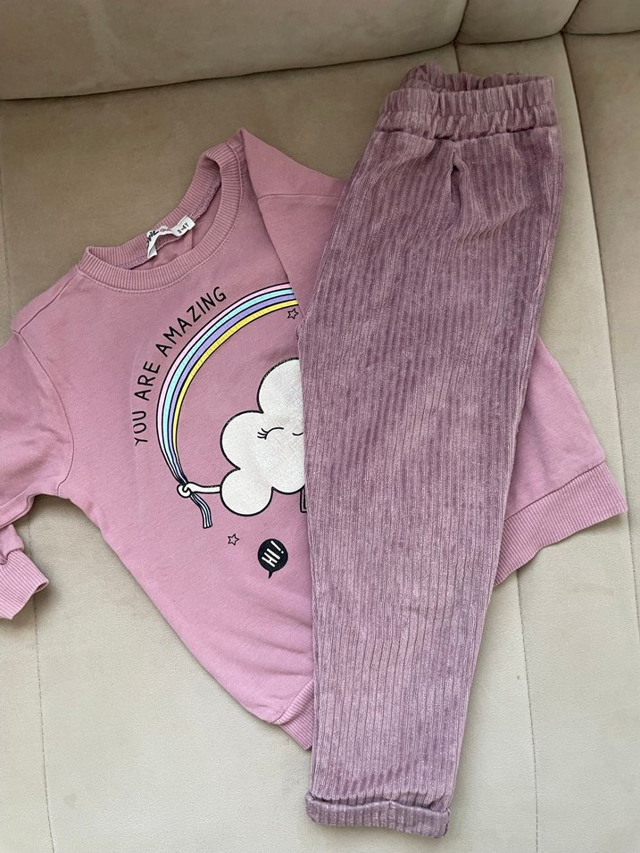 Pastel pembe renkli, uzun kollu ve örme dokulu bebek kız takımı. Üstte bulut ve gökkuşağı baskısı Alt kısmı yumuşak,