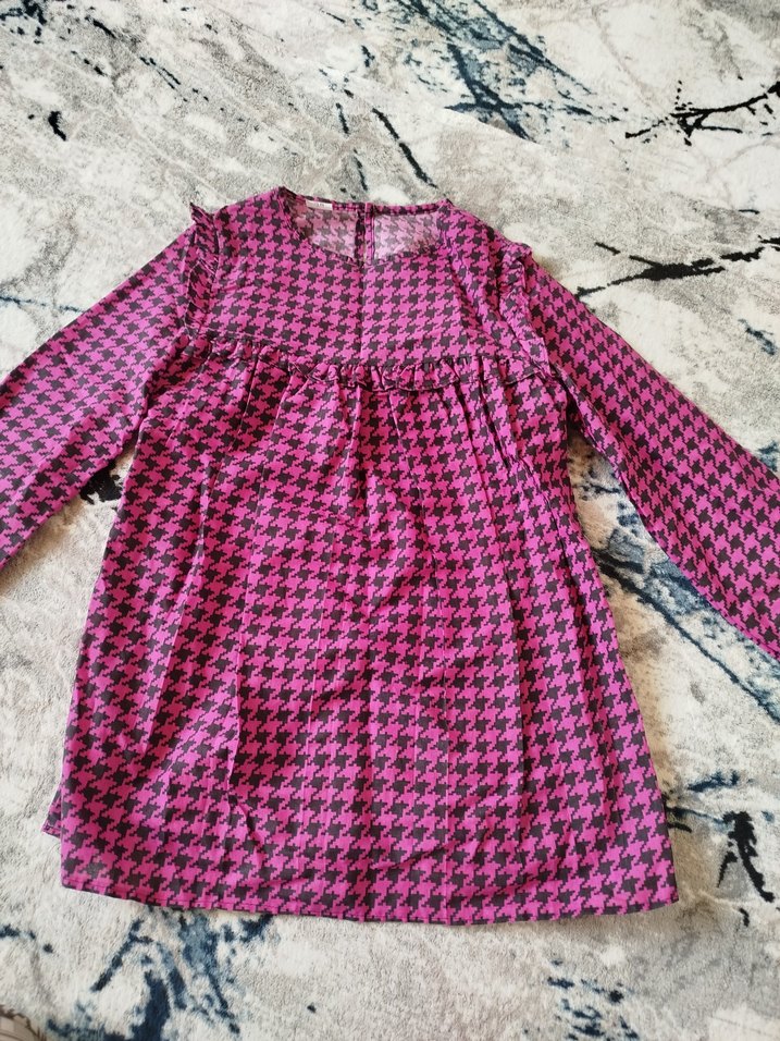 Renkli tie-dye desenli, fırfırlı ve bohem tarzda, uzun kollu, bol kesim pembe kız bluzu.