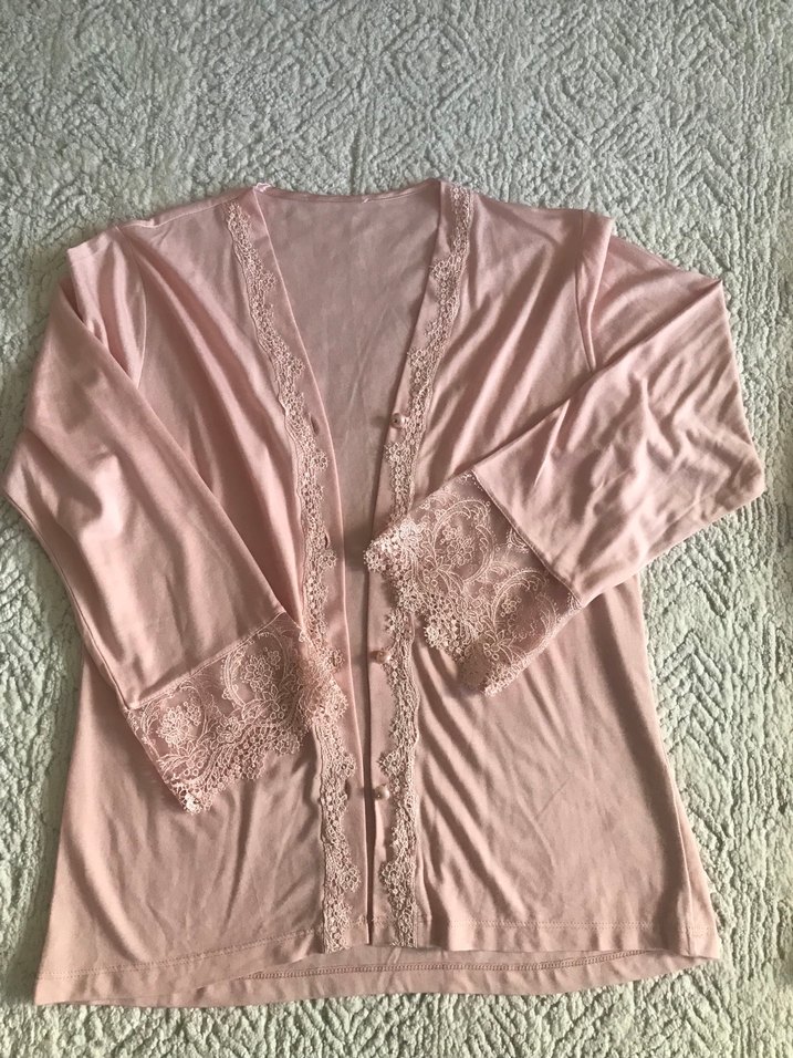 Yumuşak pastel pembe renkte, bol kesim uzun kollu kadın pijama üstü, manşetlerde ve ön kenarlarda ince dantel detaylarıyla rahat ve bohem tarz sunar.