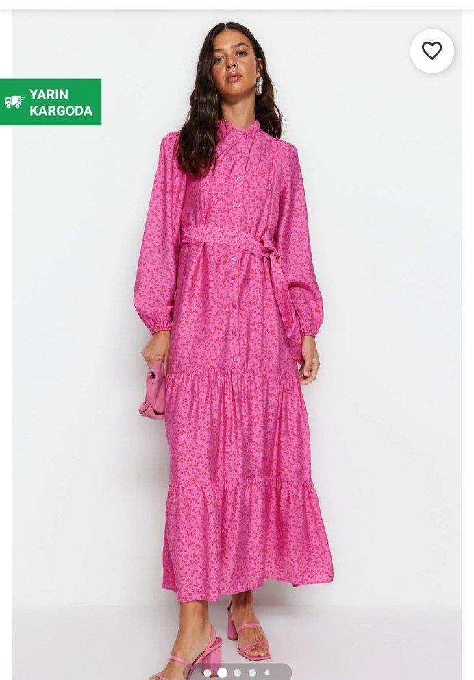 Yüksek yakalı, fırfırlı ve uzun kollu, bol kesim pembe tie-dye desenli uzun elbise. Sentetik kumaştan, romantik buluşmalar için ideal.
